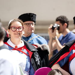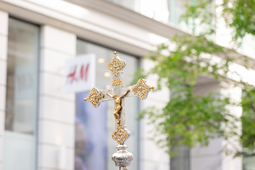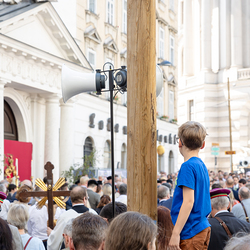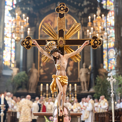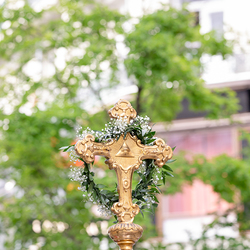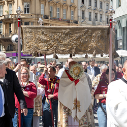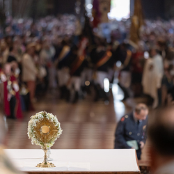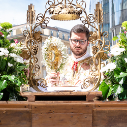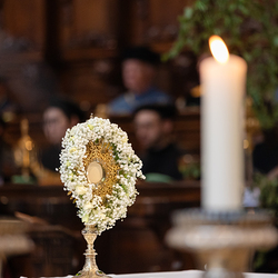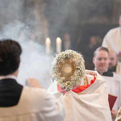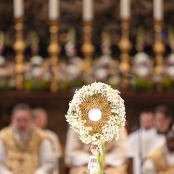 Zu Fronleichnam bringen wir Katholiken öffentlich unseren Glauben zum Ausdruck, dass Gott in Brot und Wein mitten unter ihnen ist. Als sichtbares Zeichen wird eine reich verzierte Monstranz mit einer geweihten Hostie in feierlicher Prozession durch die Straßen getragen.